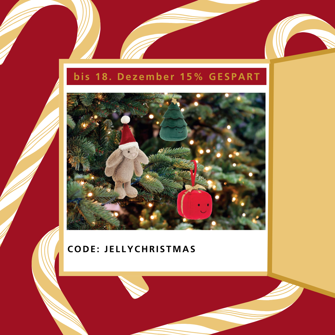 Ein besonderes Geschenk, eine tolle Deko oder eine neue kuschelige Weihnachtsfreund:in - in unserer wunderschönen Jellycat Weihnachtskollektion findest Du immer das richtige. In dieser Woche kannst Du 15% mit dem Code JELLYCHRISTMAS auf alle vorrätigen Artikel sparen. Gültig bis 19. Dezember, 23:59h. Bis zu diesem Termin kommen auch alle Onlinebestellungen noch vor Weihnachten an.