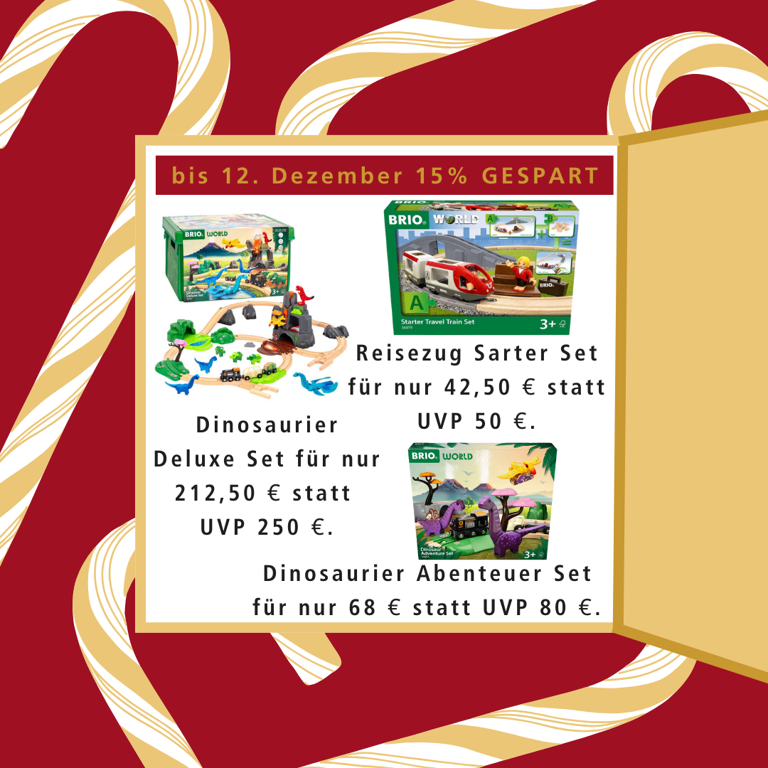 Entdecke jetzt unser Brio Sortiment und spare bis 12. Dezember, 23.59 h. Mit dem Code BRIOWEIHNACHT erhältst Du das großartige Dinosaurier Deluxe Set mit bespielbarer Aufbewahrung, das Dinosaurier Abenteuer Set und das Reisezug Starter Set ganze 15% günstiger.